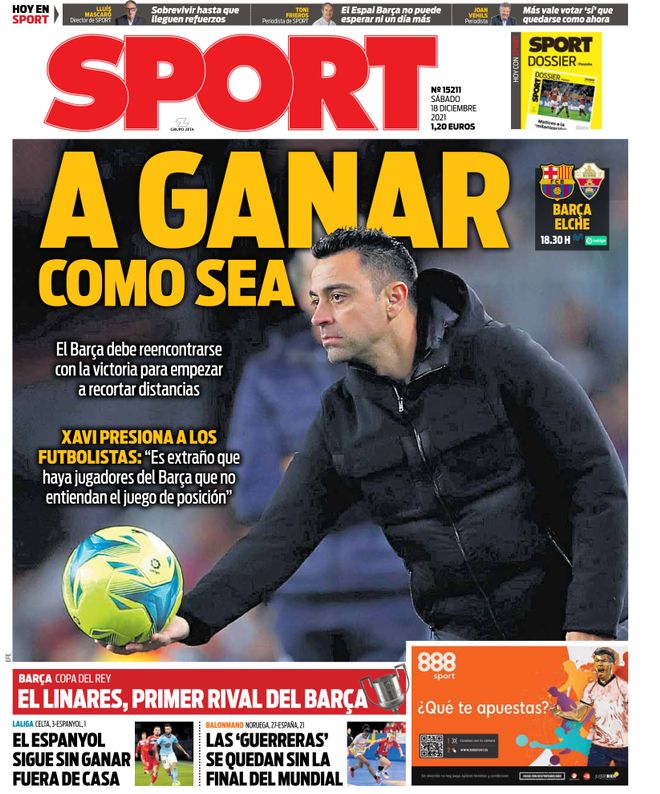 El diario Sport dedica su portada de este sábado a la drástica situación que atraviesa el FC Barcelona, a 18 puntos del Real Madrid en LaLiga y defenestrado a la Europa League: "A ganar como sea...". Se hace mención a Xavi Hernández, que está presionando a los futbolistas con sus últimas declaraciones: "Es extraño que haya jugadores del Barça que no entiendan el juego de posición".