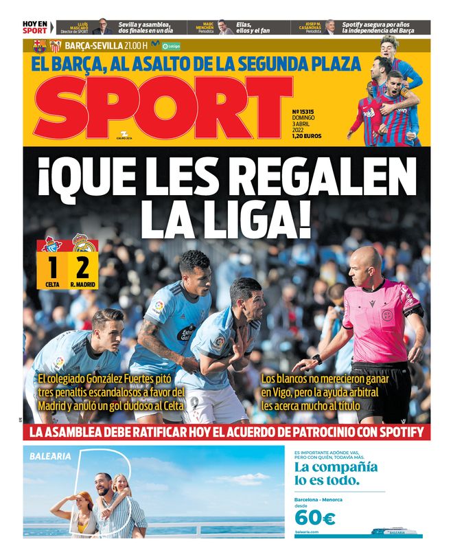El diario Sport saca hoy en portada el triunfo del Real Madrid en Vigo y, para variar, se queja de la actuación arbitral.
