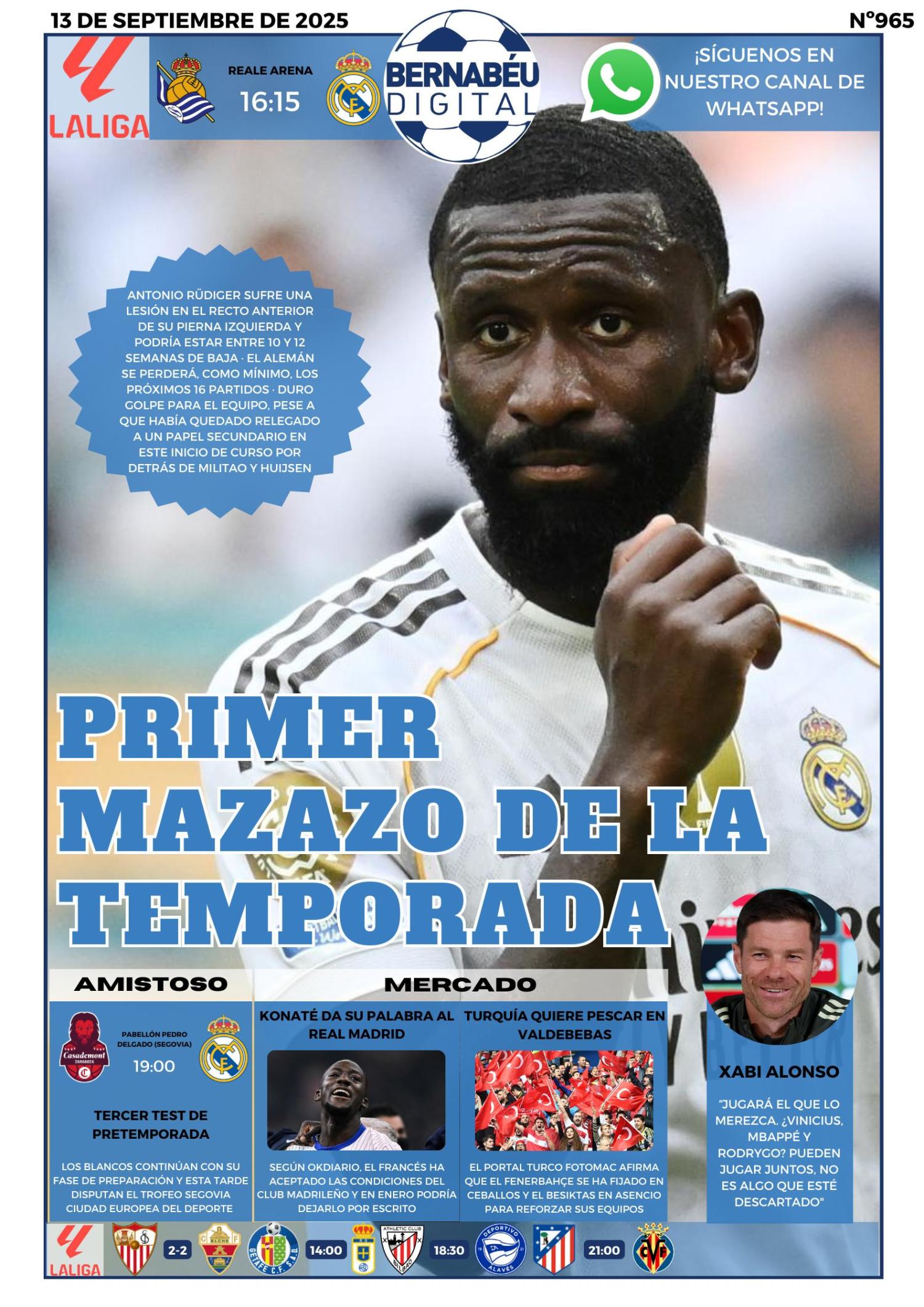Para este sábado 12 de septiembre, Bernabéu Digital destaca en su portada la lesión de Antonio Rüdiger, que tiene para tres meses por un contratiempo en el recto anterior de su pierna izquierda.