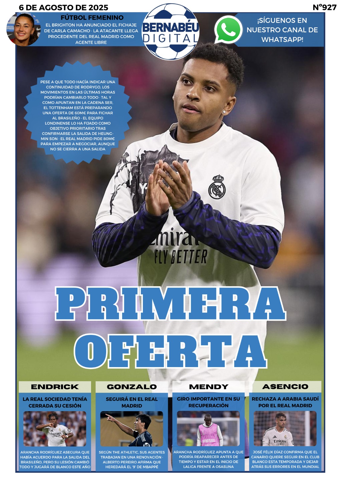 En la portada BD de este miércoles destacamos la oferta inminente del Tottenham por Rodrygo. Asimismo, hacemos referencia al futuro de Endrick y Gonzalo, la recuperación de Mendy, el plan de Asencio y el fichaje de Carla Camacho por el Brighton.