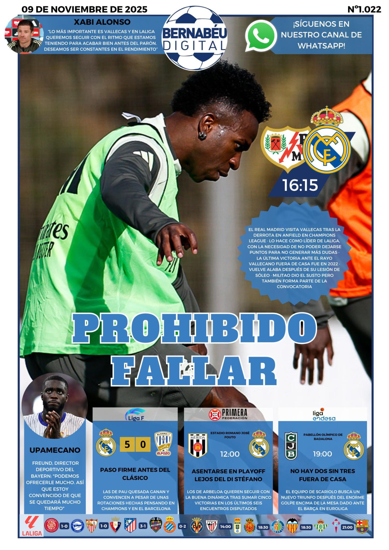 Bernabéu Digital destaca en su portada BD la previa del Rayo Vallecano - Real Madrid, con las declaraciones de Xabi Alonso en rueda de prensa. También se resalta el triunfo del Femenino y la previa del Castilla y del equipo de Baloncesto.