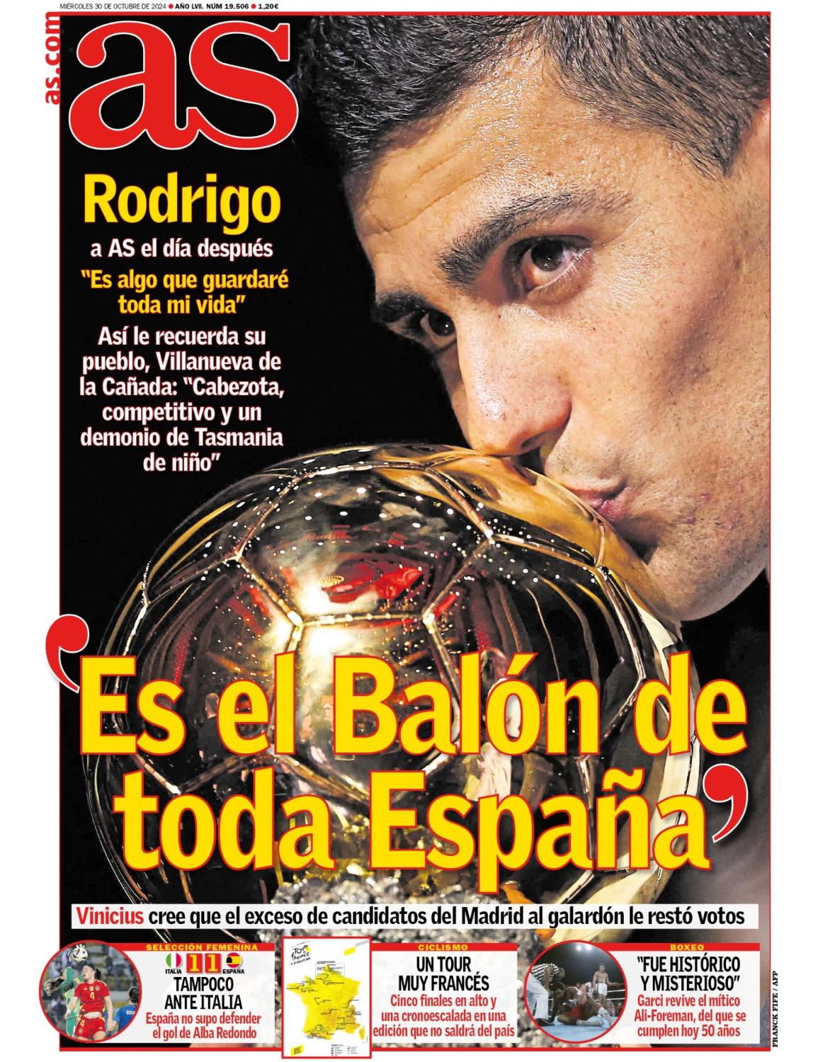Este miércoles 30 de octubre de 2024, el diario as saca en portada una entrevista con Rodri después de ganar el Balón de Oro. Además, destaca la creencia de un Vinicius Junior que, según el periódico, considera que el hecho de que hubiera varios madridistas nominados al premio de mejor futbolista del año le afectó negativamente en las votaciones.