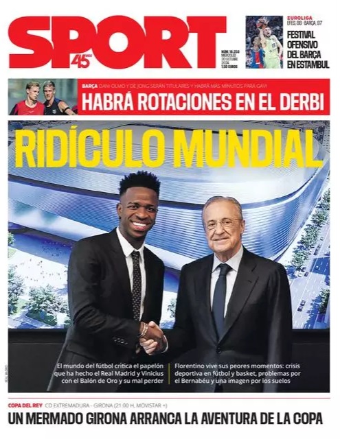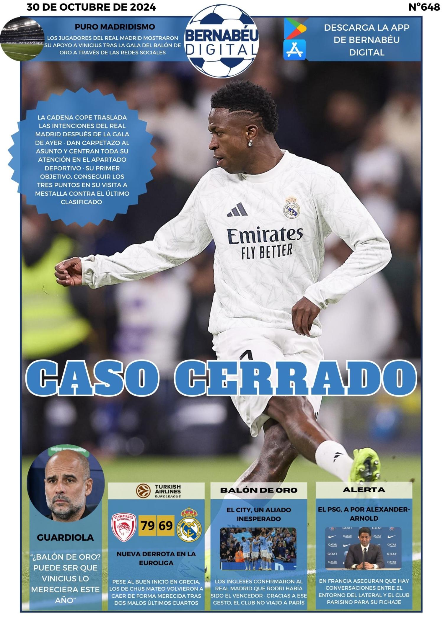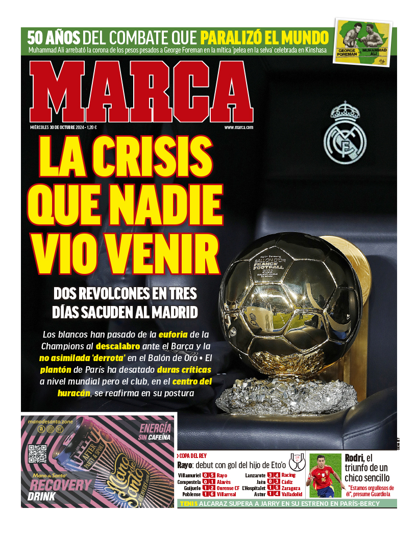 Este miércoles 30 de octubre de 2024, el diario as saca en portada una entrevista con Rodri, recién nombrado mejor futbolista del mundo; el diario Marca destaca la "crisis" inesperada que se ha formado en el Real Madrid desde la derrota en el clásico hasta lo ocurrido el pasado lunes con los premios del Balón de Oro, mientras que el diario Sport habla directamente de "ridículo mundial". Por último, en Bernabéu Digital llevamos en primera plana la reacción del conjunto madridista tras el escándalo del Balón de Oro.