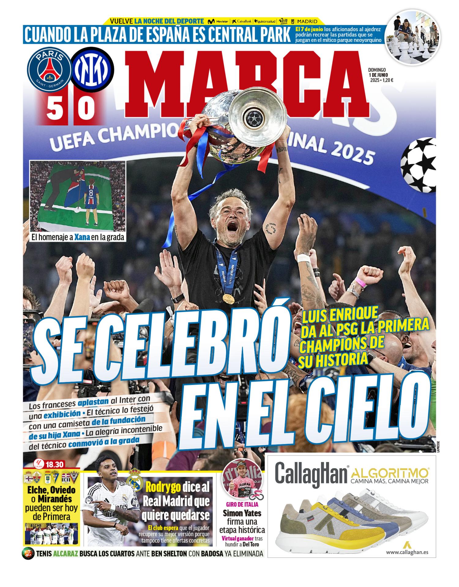 El diario Marca abre con el triunfo del PSG en la final de la Champions League. También hacen referencia a los planes de Rodrygo Goes con respecto a su futuro en el Real Madrid.