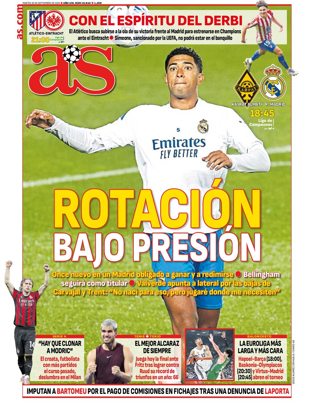 El diario AS destaca en su primera plana la previa del partido entre el Kairat Almaty y el Real Madrid que se disputará en el estadio del equipo kazajo este martes a las 18:45.