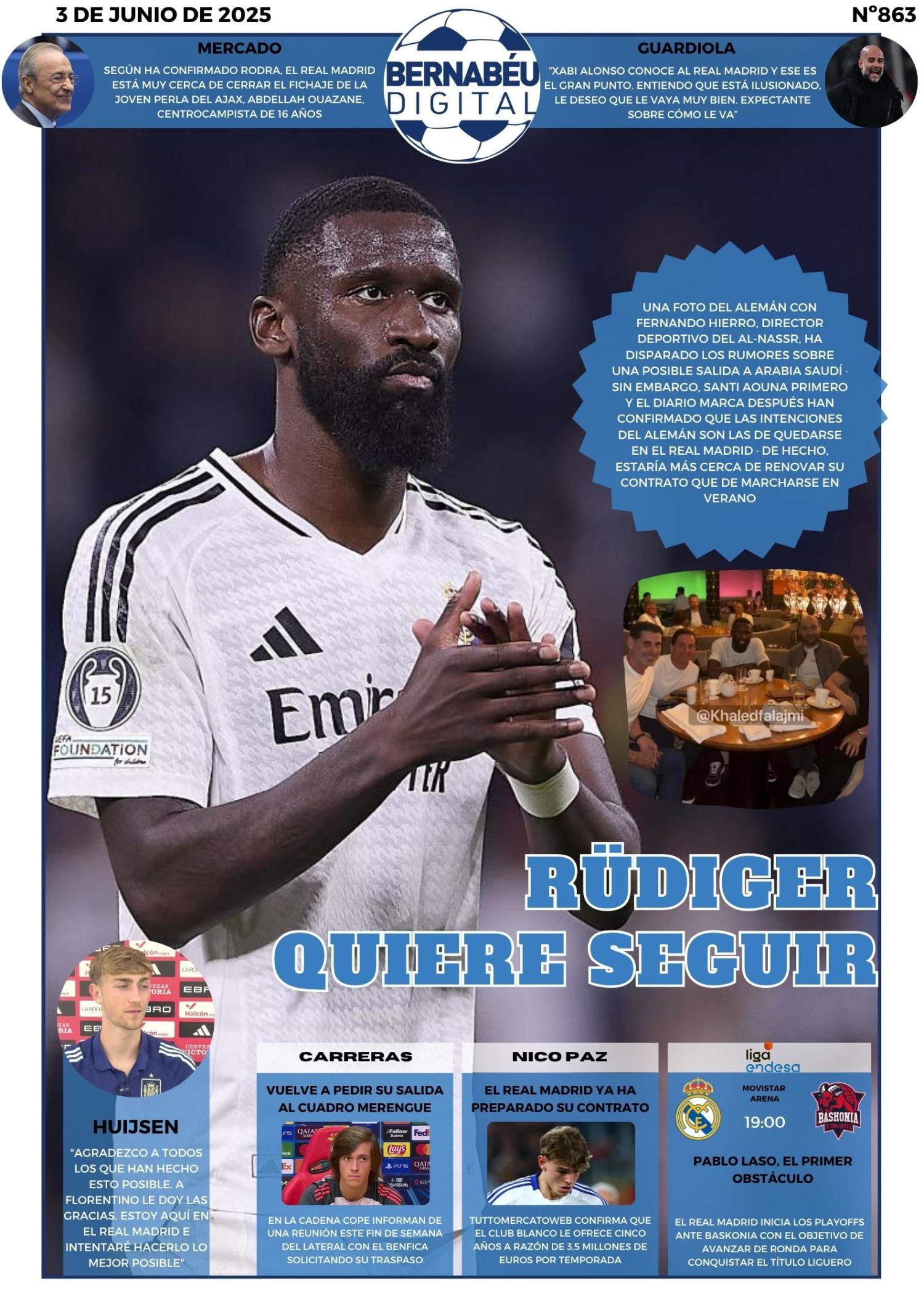 En la portada BD de este martes destacamos las intenciones de Rüdiger con respecto a su futuro. Además, hacemos referencia a la reunión de Carreras y el Benfica, las palabras de Huijsen y Guardiola, la previa de baloncesto, el interés en la perla del Ajax y el contrato de Nico Paz.