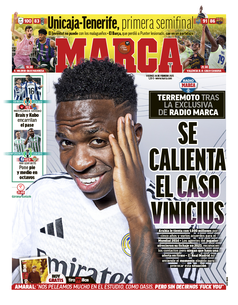 Este viernes 14 de febrero de 2025, el diario Marca saca en portada el