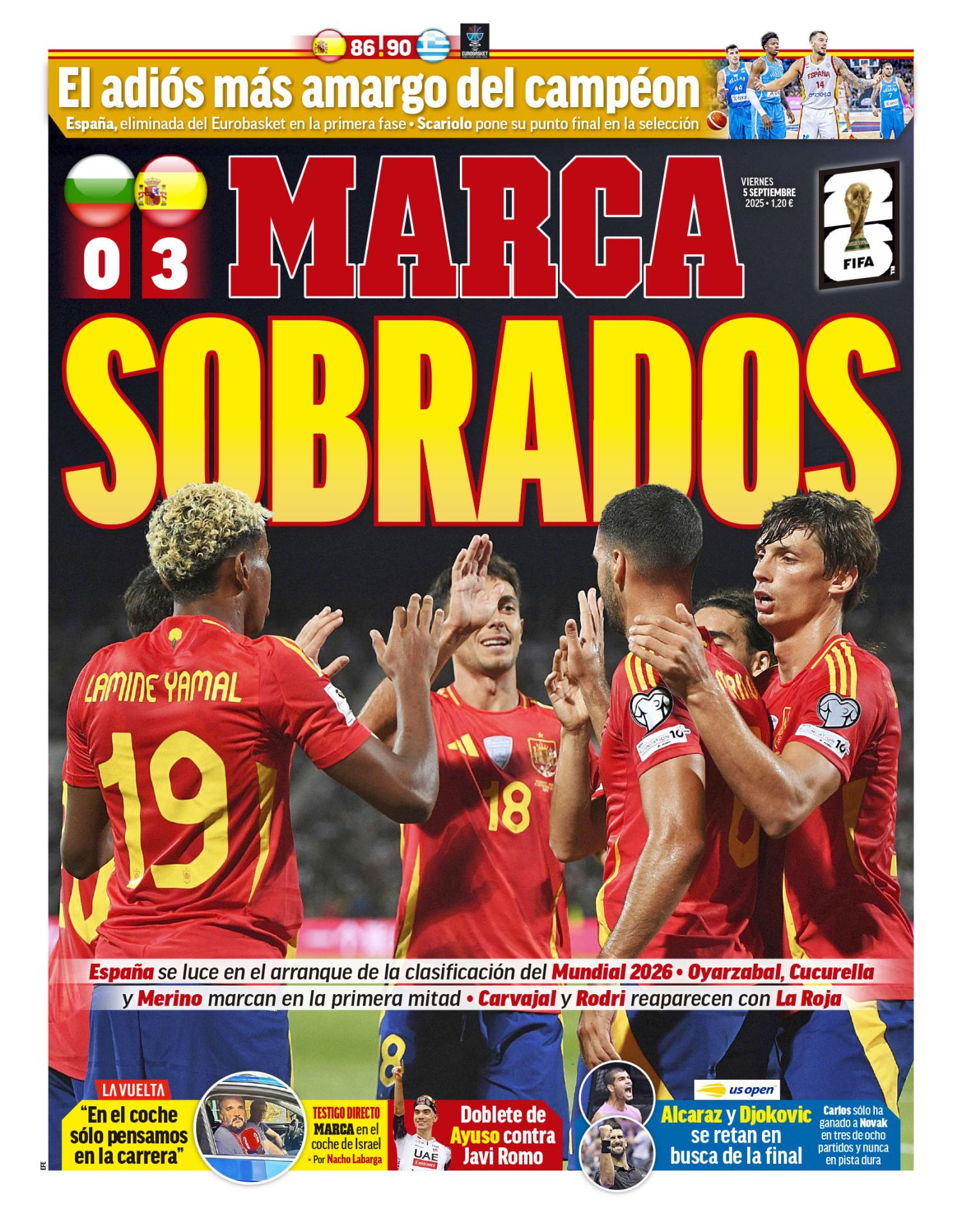 El diario Marca, en su portada para este viernes 5 de septiembre de 2025, destaca la victoria de la selección española frente a Bulgaria. "Sobrados", titula.