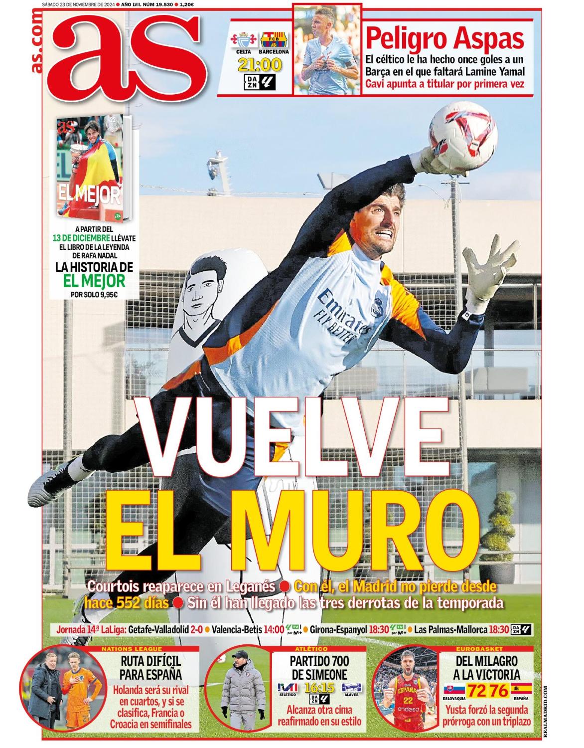 El diario as destaca en su portada del sábado 23 de noviembre de 2024 a un Thibaut Courtois que volverá a ocupar la portería del Real Madrid en el próximo partido de liga ante el Leganés (domingo, 18:30 horas). El belga ya está recuperado de su última lesión muscular y defenderá nuevamente el arco de un conjunto merengue que, con él sobre el verde, acumula 552 días sin perder.