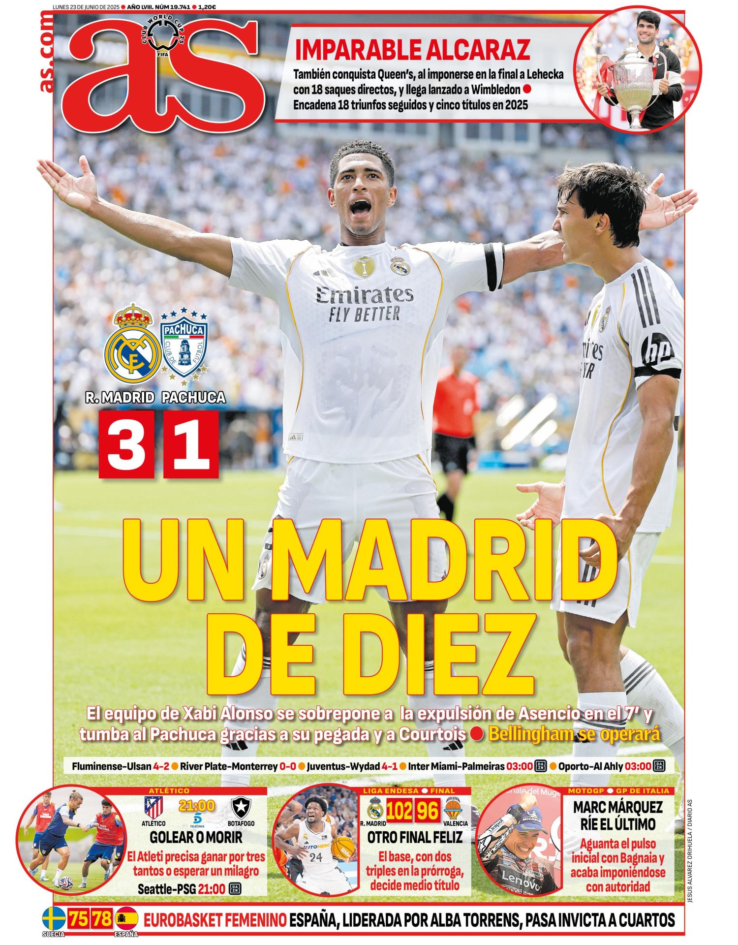 El diario as, en su portada para este lunes 23 de junio de 2025, destaca la victoria del Real Madrid frente al Pachuca (3-1). "Un Madrid de diez", titula.