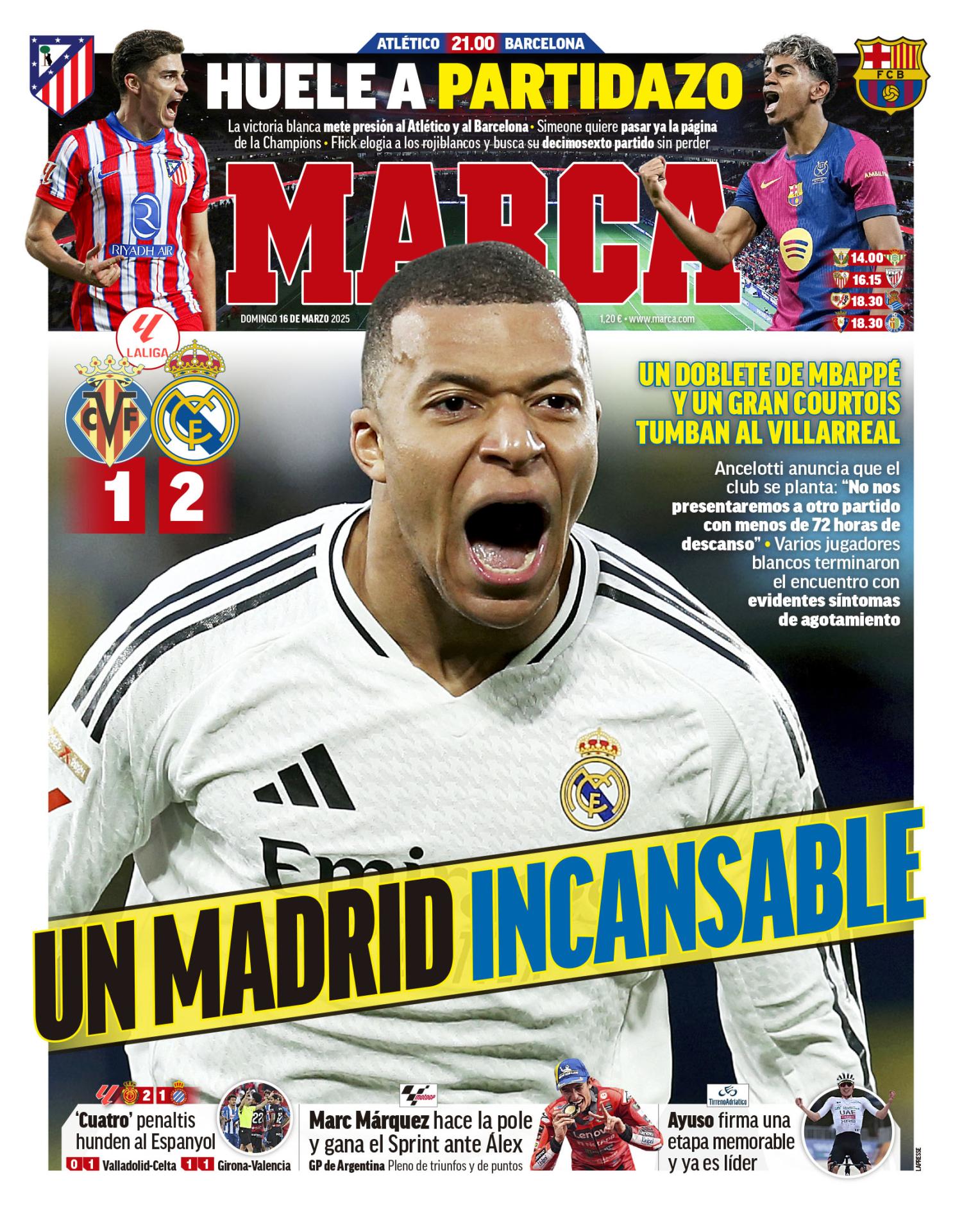 El diario Marca destaca en su primera plana el partido de la Liga EA Sports entre el Villarreal y el Real Madrid que ha terminado con victoria blanca gracias al doblete de Mbappé.