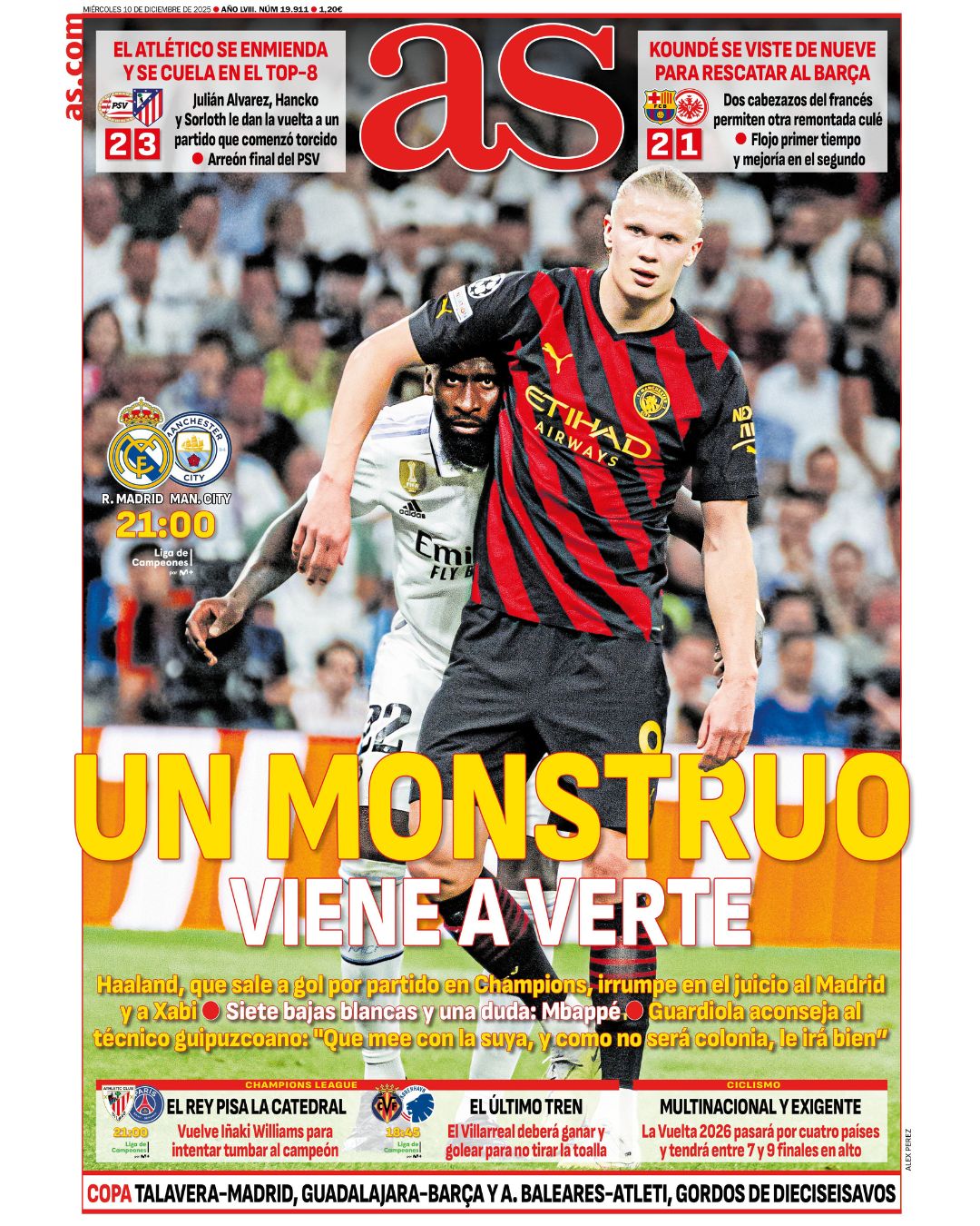 El diario AS saca en primera plana el duelo de Antonio Rüdiger contra Erling Haaland, ya de sobra conocido en la Champions cuando se enfrentan el Real Madrid y el Manchester City.