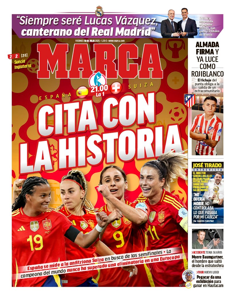 La portada del viernes del diario Marca destaca la previa del España - Suiza de la Eurocopa femenina.