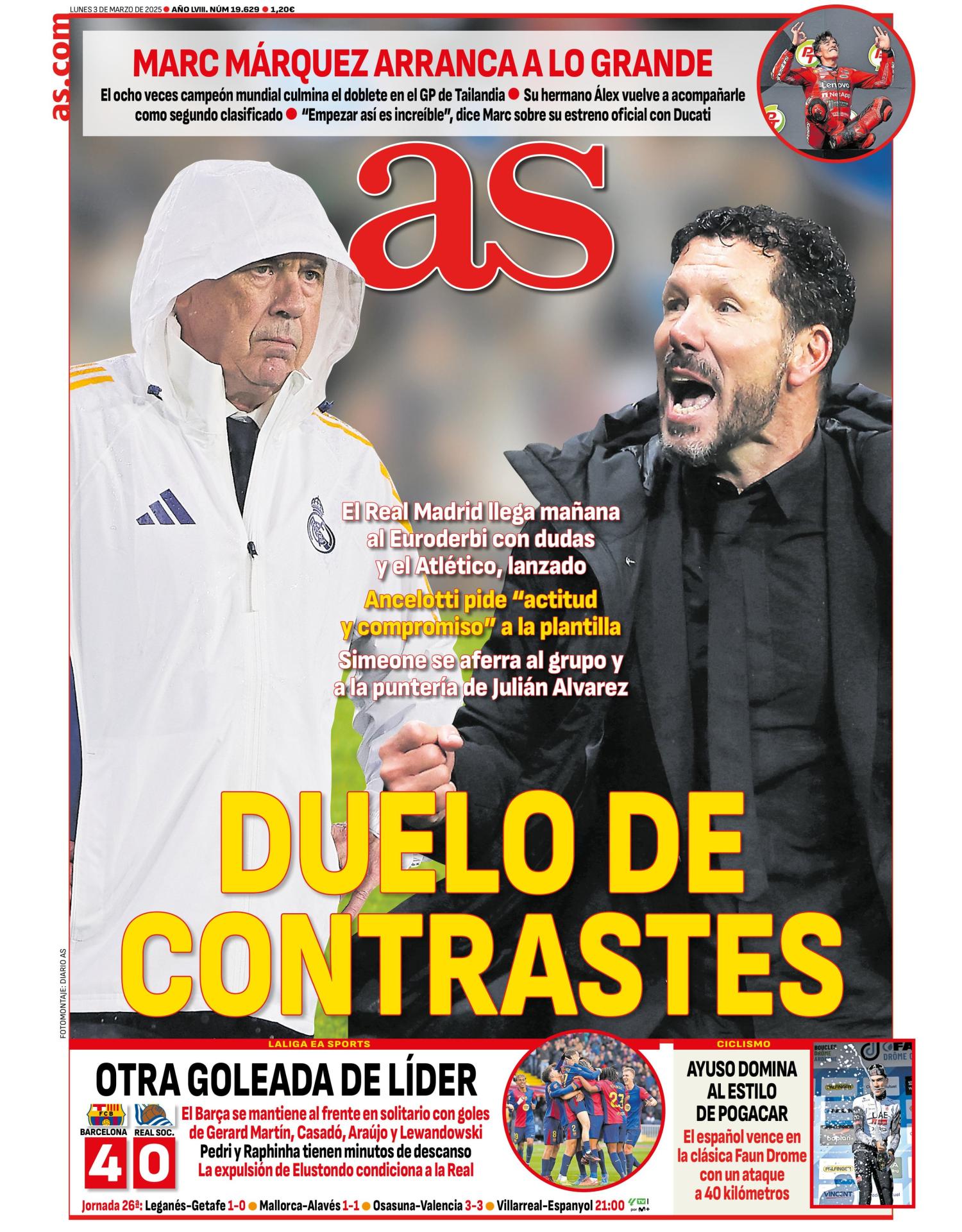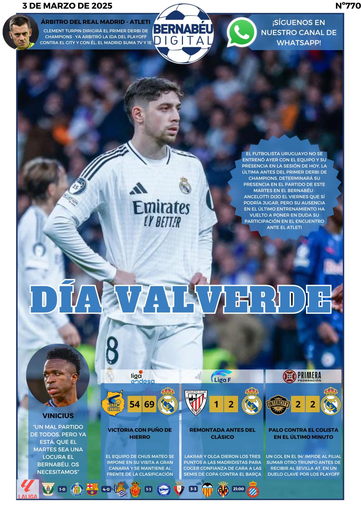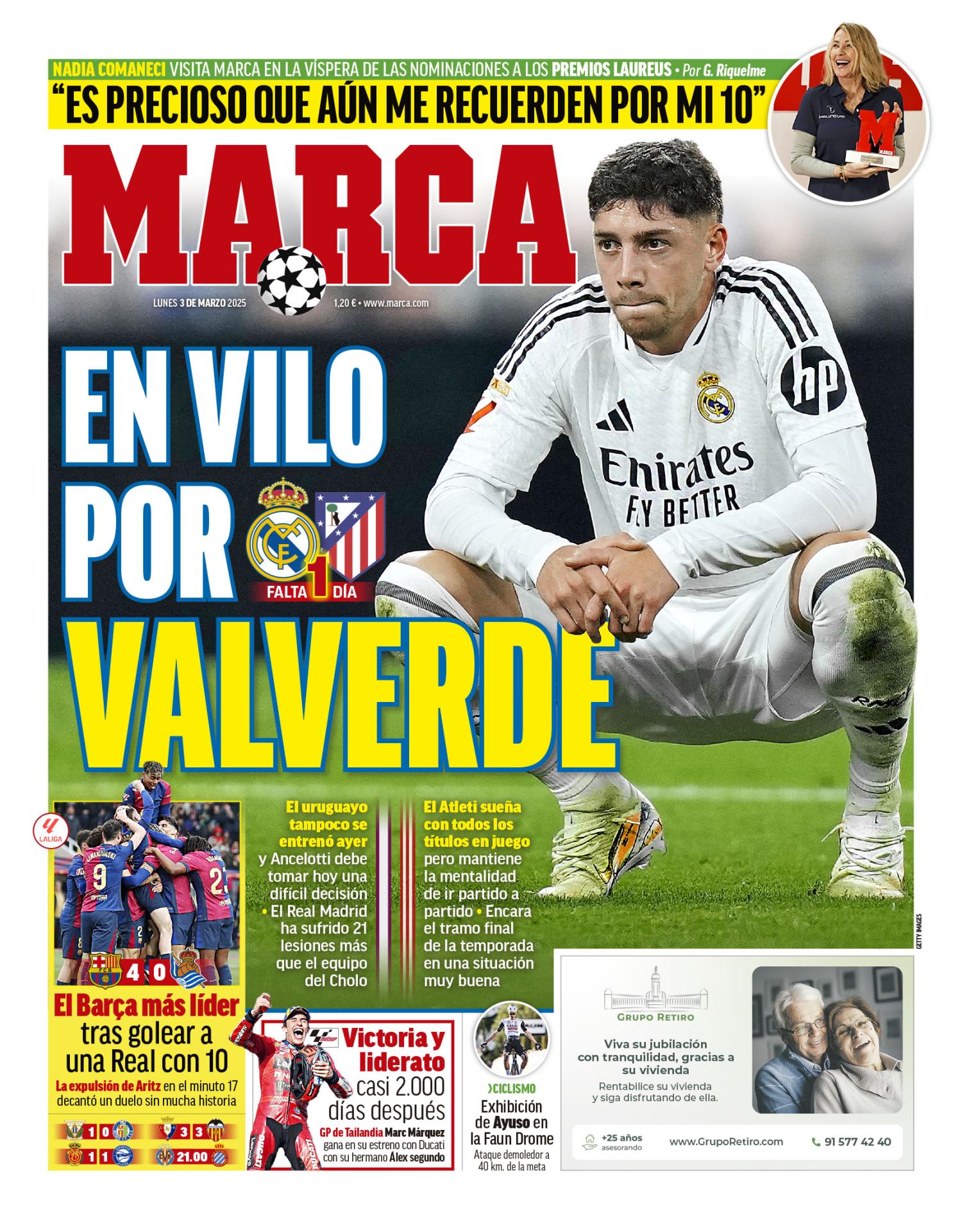 Este lunes 3 de marzo de 2025, las portadas deportivas se centran el estado físico de Fede Valverde y en cómo llegan el Real Madrid y el Atlético al primer derbi de Champions, entre otros temas.