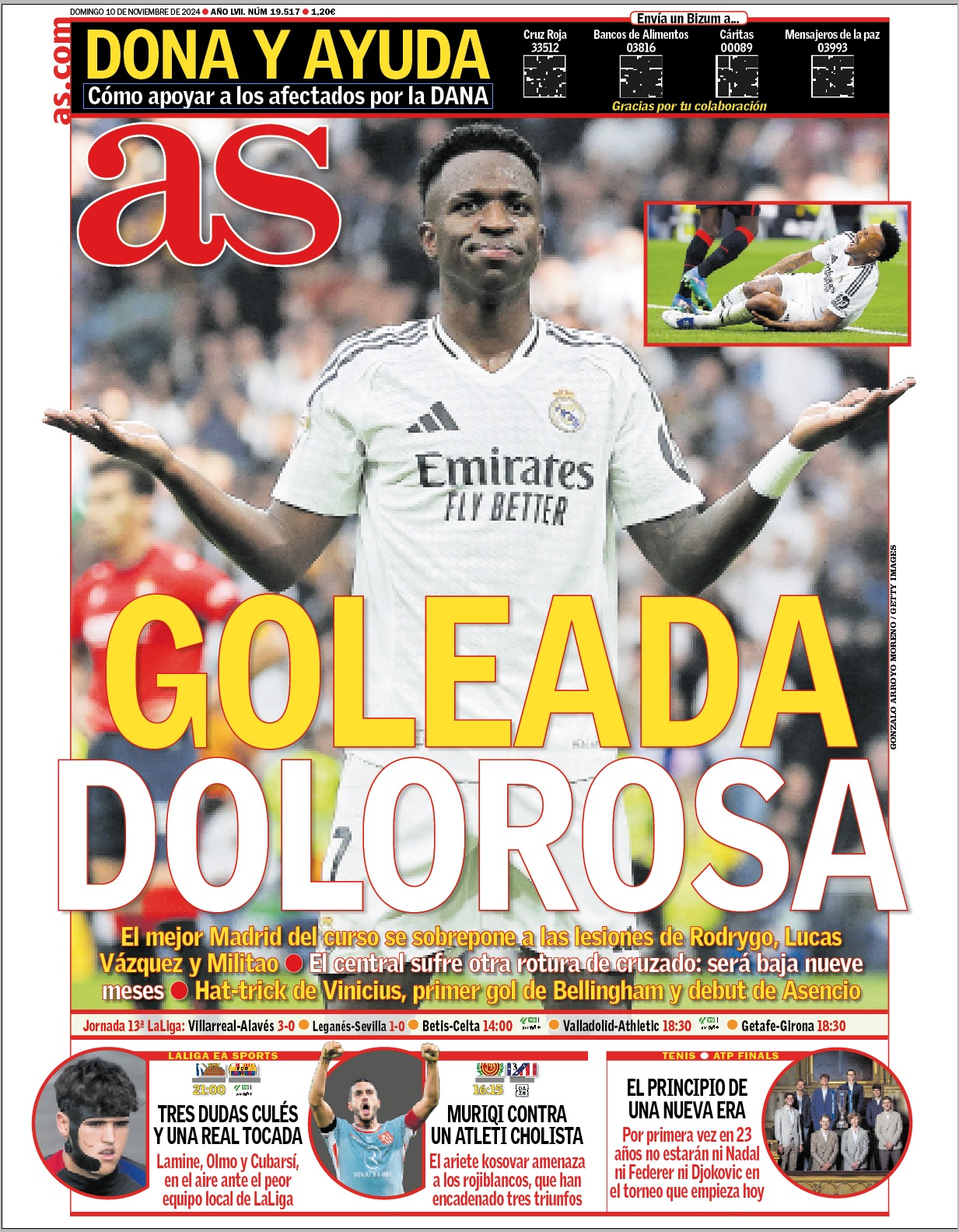 Este domingo 10 de noviembre de 2024, las portadas deportivas se centran en la victoria del Real Madrid ante Osasuna. En primer lugar, el diario as destaca la "goleada dolorosa" de los blancos a causa de las lesiones de Lucas, Militao y Rodrygo. Algo de lo que también nos hemos hecho en Bernabé Digital: "Sonrisas y lágrimas", titulamos en nuestra portada. Por su parte, el diario Marca resalta a Vinicius por su hat-trick con el que ha despertado al conjunto madridista. Por último, Sport sale con el Real Sociedad - FC Barcelona.