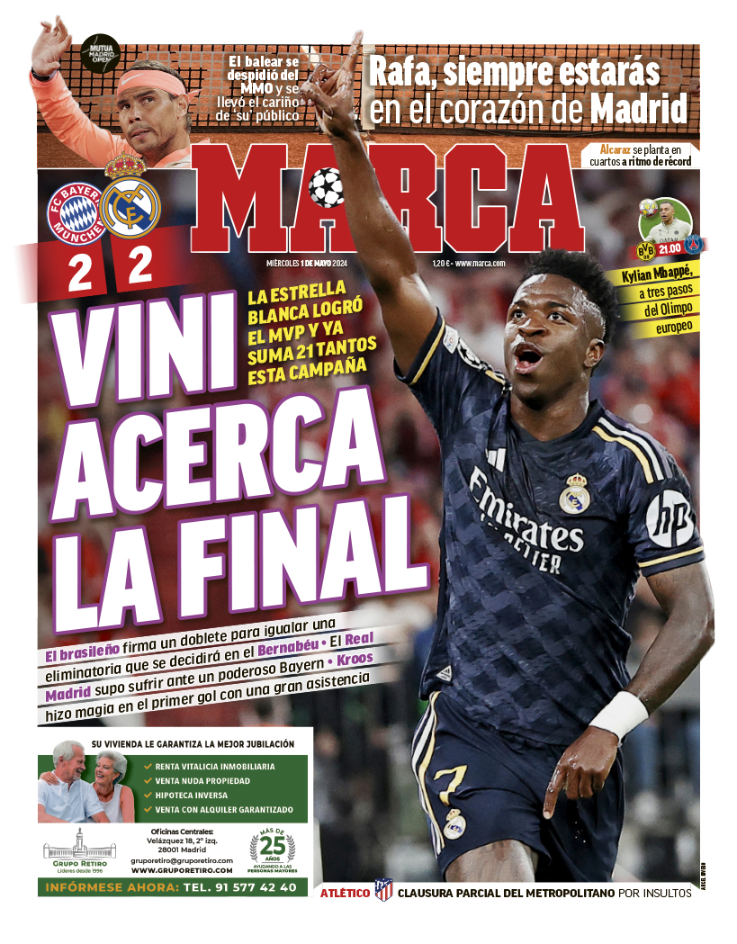 Vinicius protagoniza las portadas deportivas del 1 de mayo de 2024