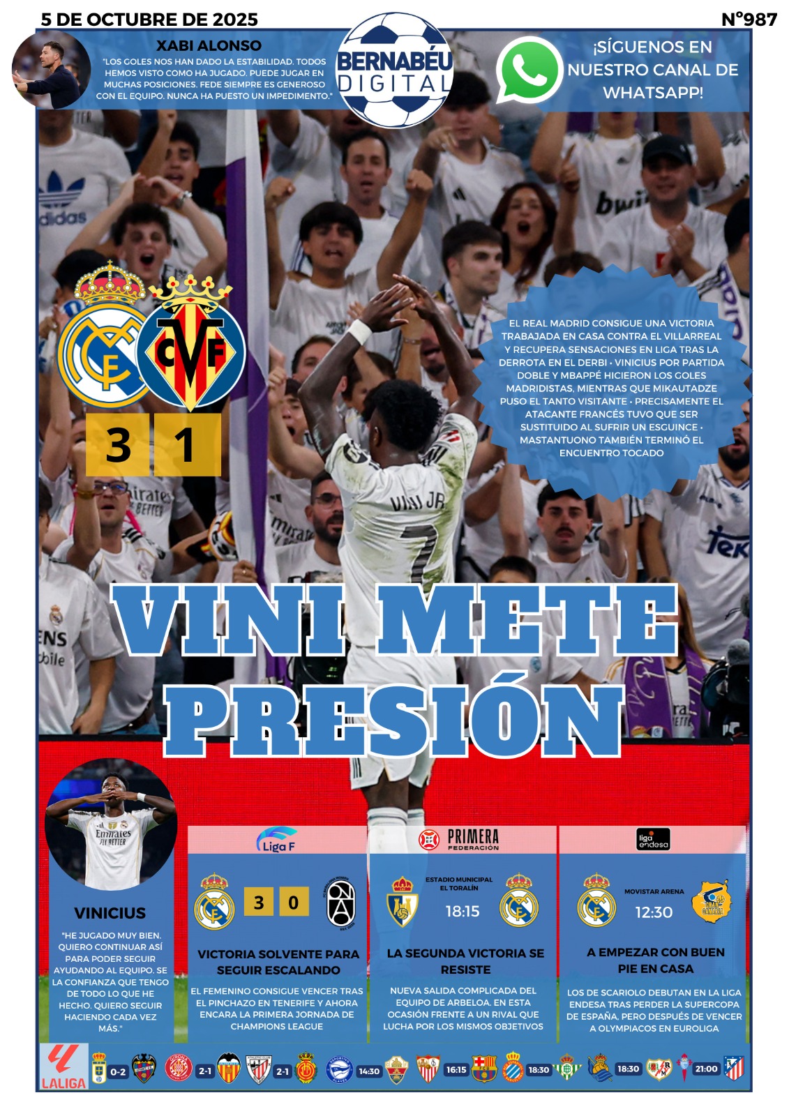 Bernabéu Digital destaca en su portada BD a Vinicius con la victoria del Real Madrid. Además, también se resalta las declaraciones de Xabi Alonso, del propio brasileño, y el triunfo del Real Madrid Femenino.