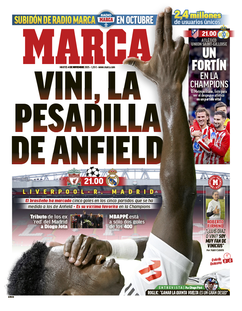 La portada del martes del diario Marca destaca los cinco goles que Vinicius ha marcado en su carrera al Liverpool.