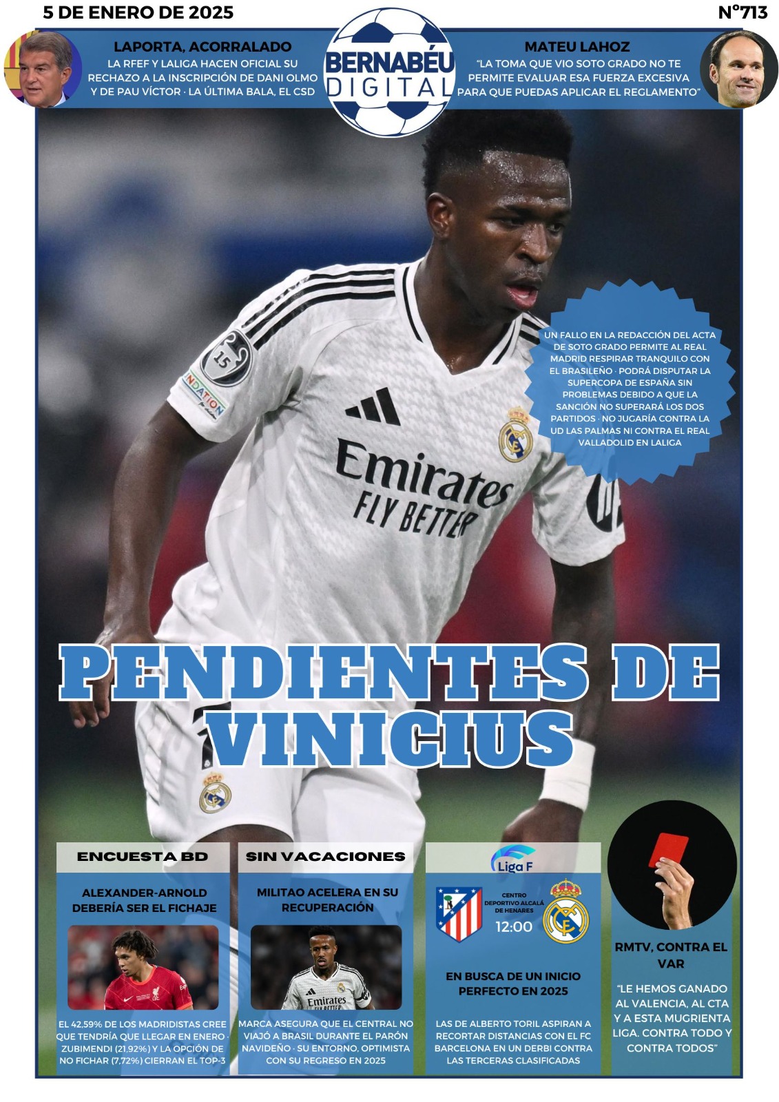 Bernabéu Digital destaca en su portada a Vinícius Júnior y el fallo del árbitro a la hora de redactar en el acto lo ocurrido, que hace respirar tranquilo al Real Madrid con la sanción.