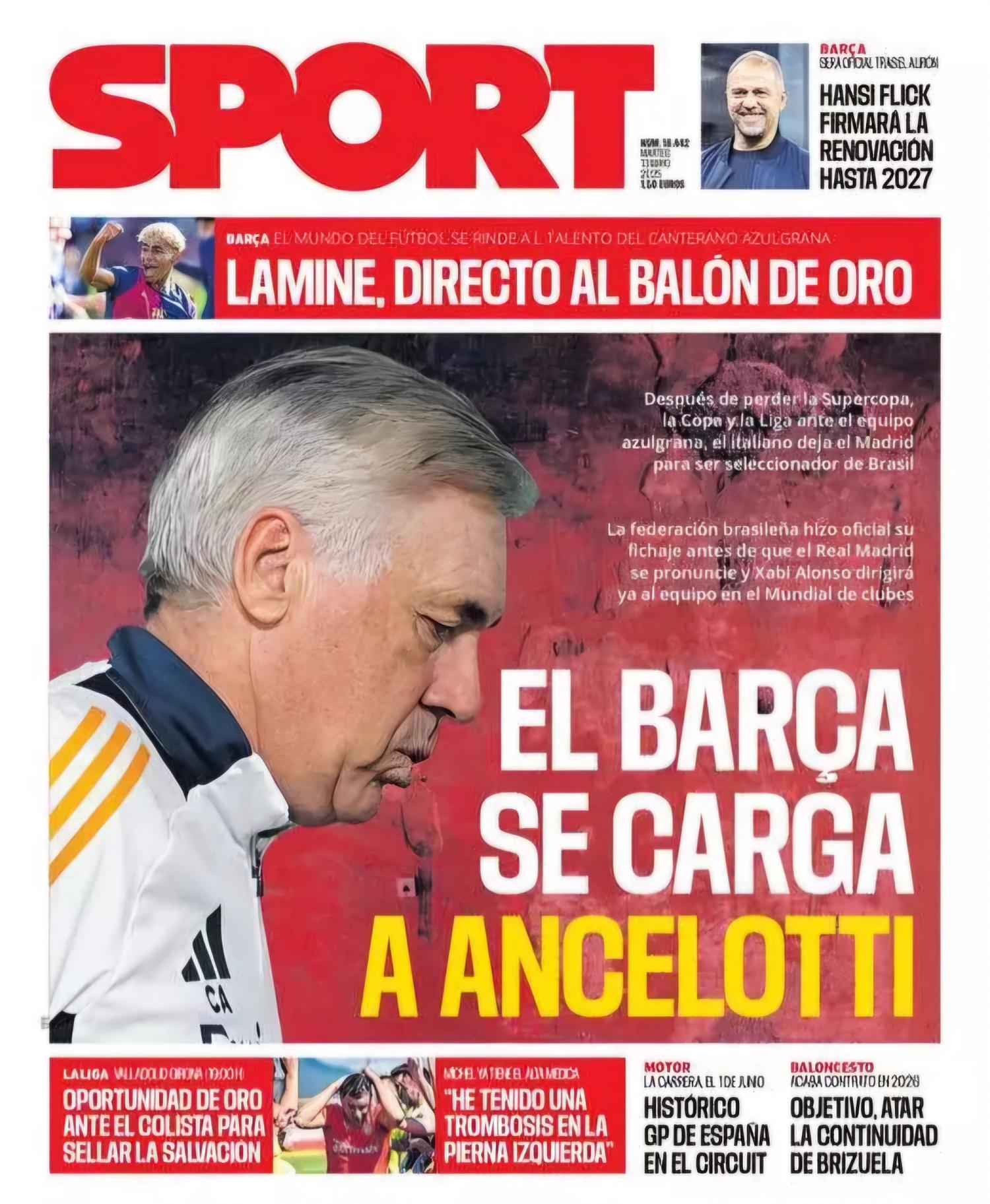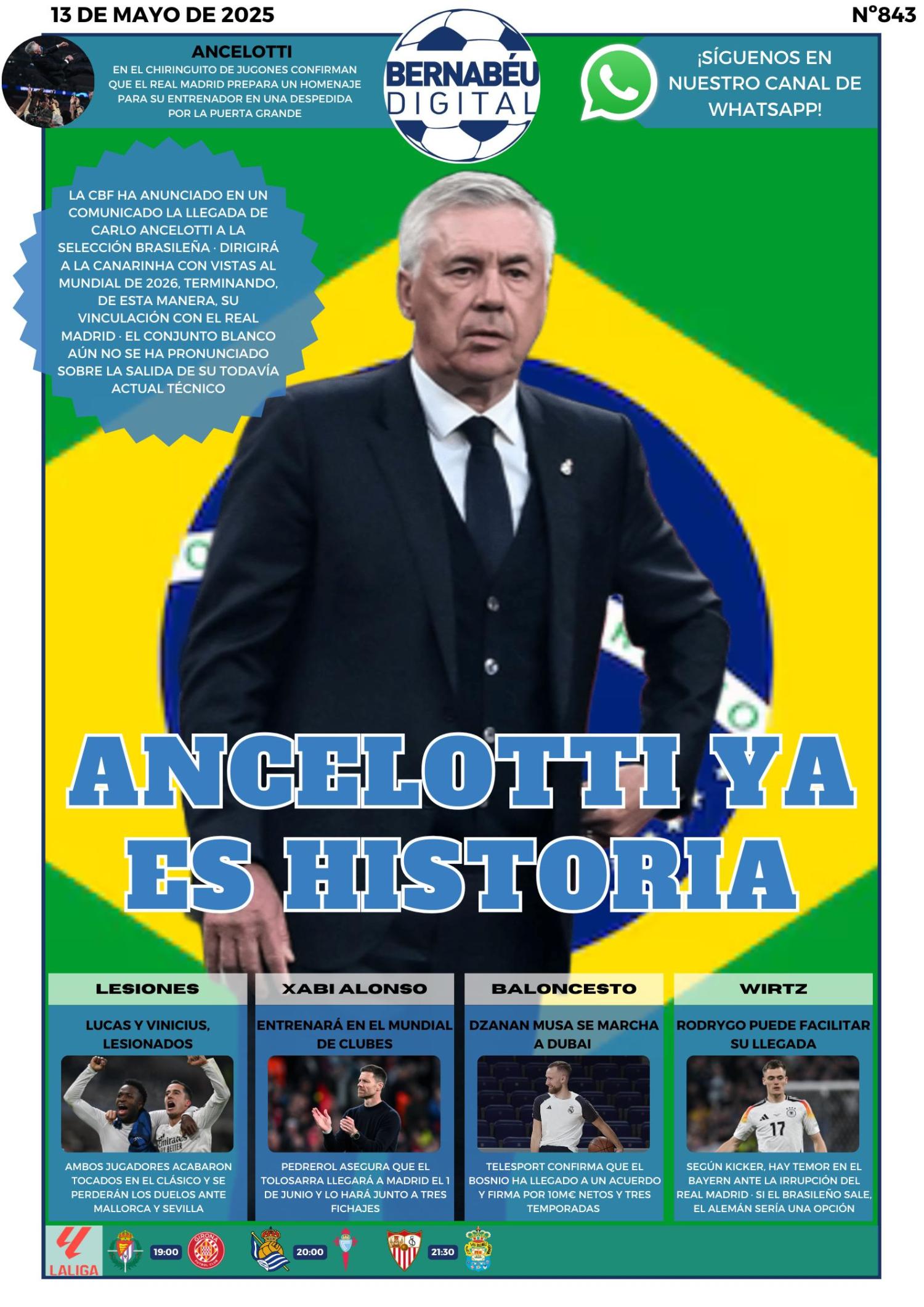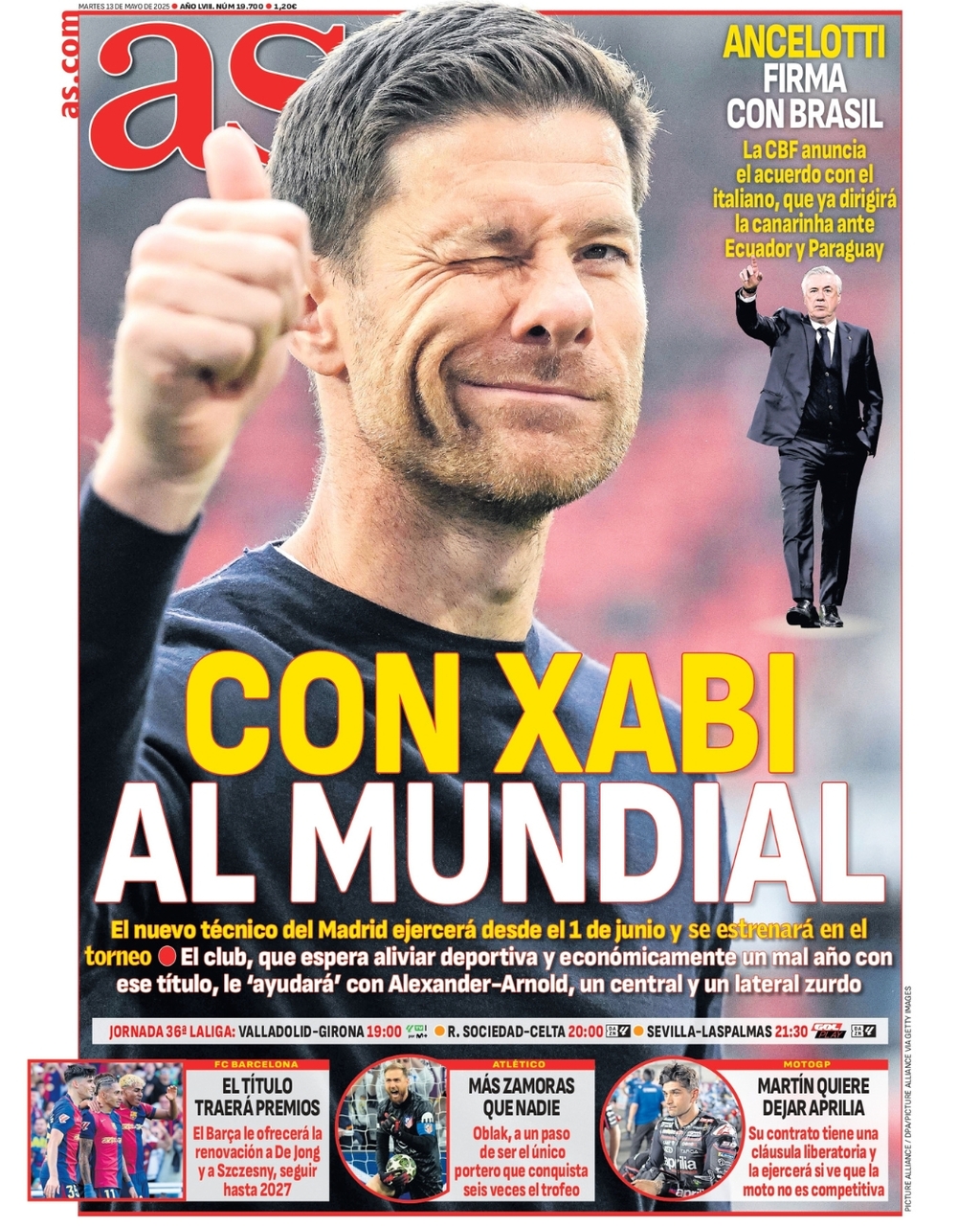 Xabi Alonso, que dirigirá al Real Madrid en el Mundial de Clubes, y Carlo Ancelotti, que abandonará Valdebebas para coger las riendas de la selección brasileña, protagonizan las portadas deportivas de este martes 13 de mayo de 2025.