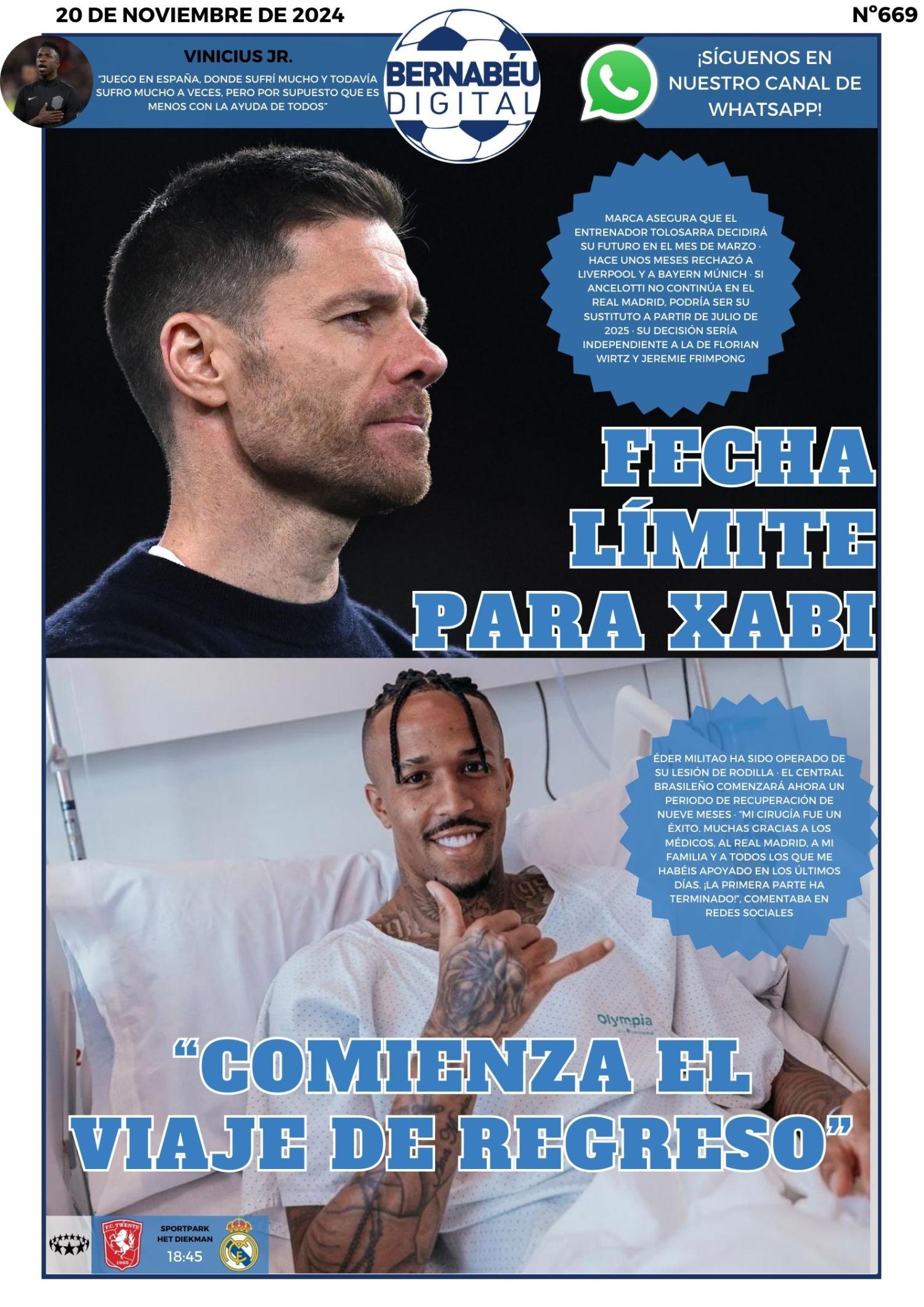 En Bernabéu Digital destacamos en nuestra portada a Xabi Alonso y a Éder Militao. El entrenador tolosarra decidirá su futuro en el mes de marzo según Marca. Si Carlo Ancelotti sale del Real Madrid, sería el gran candidato para reemplazar al italiano en el banquillo del Santiago Bernabéu. Por otro lado, Éder Militao ha sido operado de su lesión de rodilla e iniciará un periodo de nueve meses de baja. Su regreso a los terrenos de juego es el objetivo final de la segunda fase de su lesión tras la cirugía.