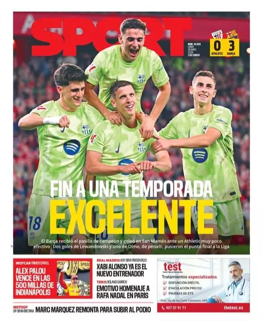 Rafael Nadal, Xabi Alonso y la victoria del Barcelona en San Mamés protagonizan las portadas deportivas de este lunes 26 de mayo de 2025.
