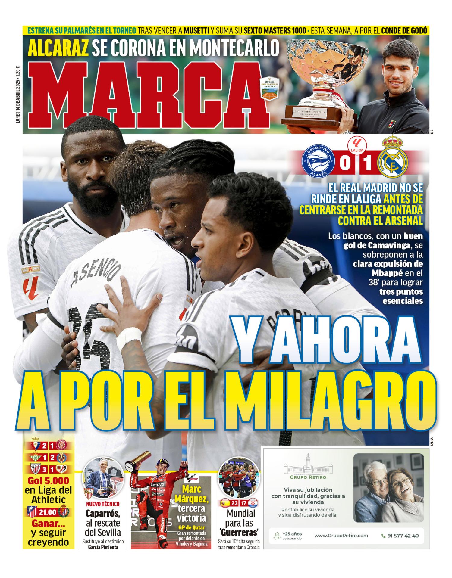 Este lunes 14 de abril de 2025, el diario Marca saca en portada la última victoria del Real Madrid ante el Alavés en Mendizorroza y titula: "Y ahora a por el milagro".