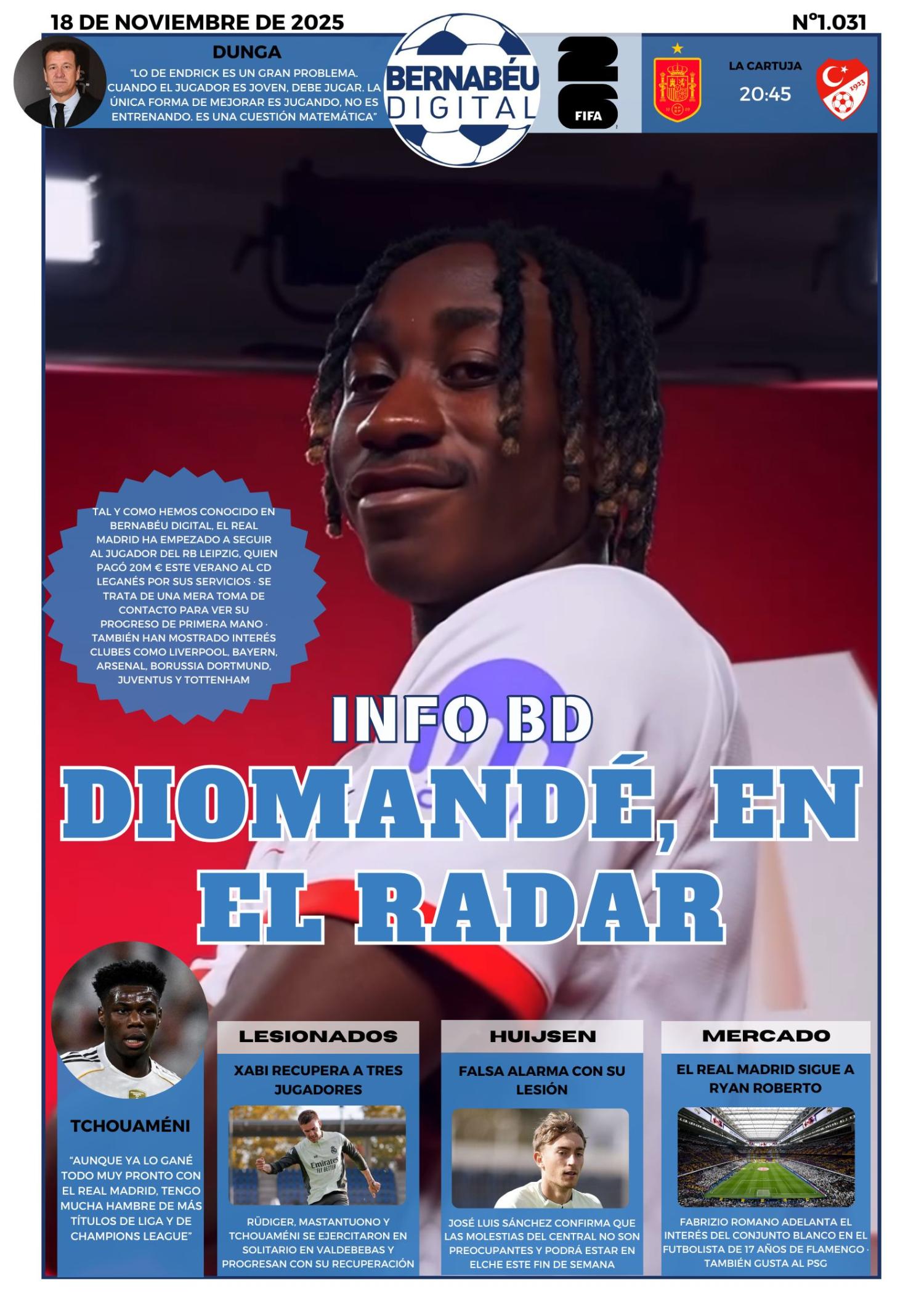 En nuestra portada del martes 18 de noviembre de 2025, en Bernabéu Digital hemos decidido abrir con la última INFO BD sobre la vigilancia que mantiene el Real Madrid en Yan Diomandé.
