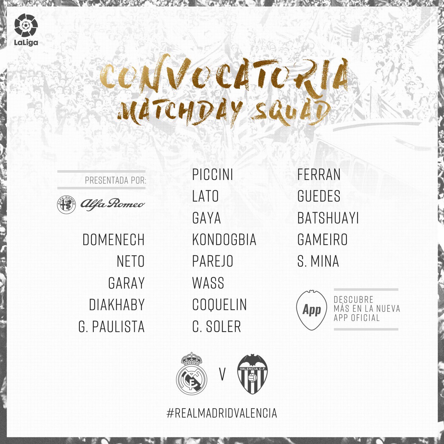 El Valencia C.F ha dado a conocer los convocados que se lleva Marcelino García Toral a Madrid para enfrentarse al conjunto blanco en el día de mañana a partir de las 20:45 horas en el Santiago Bernabéu. A destacar, la ausencia de Rodrigo que no viaja a Madrid. El delantero finalmente se ha caído de la lista después de arrastrar problemas musculares desde el pasado martes. Por otro lado, Garay y Piccini regresan a la lista y se vuelva a caer el colombiano Murillo.